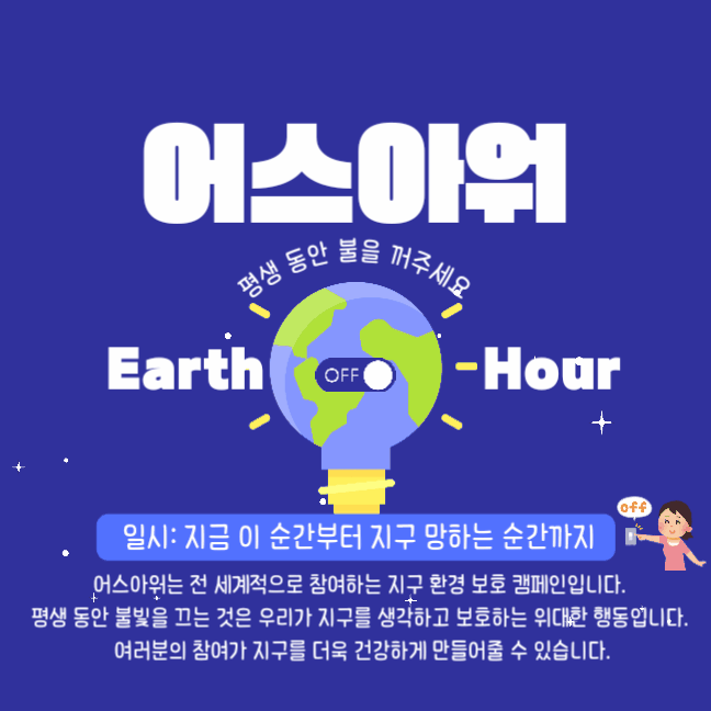 그럼 한 시간동안 전깃불을 꺼서 지구를 보호하는 캠페인에 참여하는 행동을 '어스아워(Earth Hour)'라고 하던데, 이 참에 지구가 망하는 그 순간까지 전기를 아예 쓰지 않는 캠페인을 벌이도록 하자!