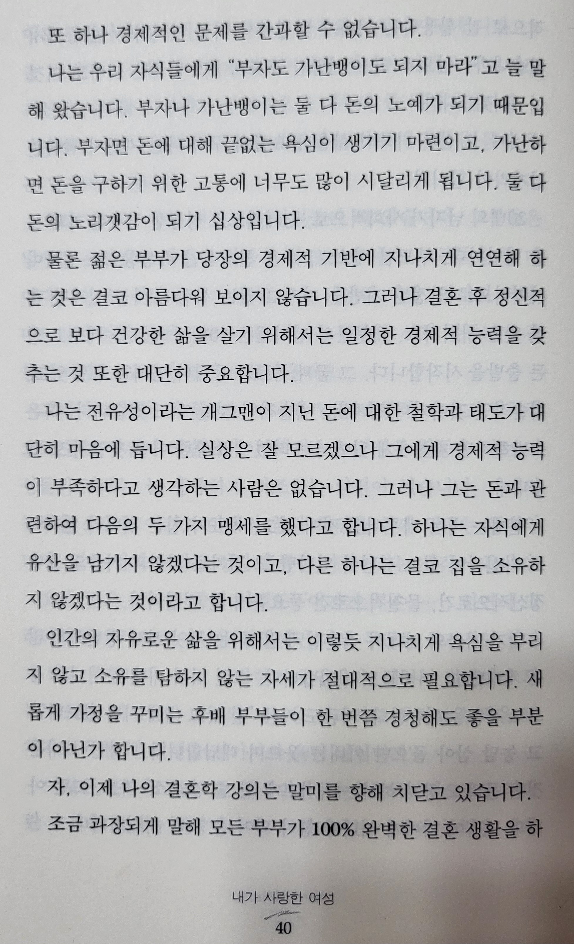 그는 이어서, "젊은 부부가 당장의 경제적 기반에 지나치게 연연해 하는 것은 결코 아름다워 보이지 않습니다. 그러나 결혼 후 정신적으로 보다 건강한 삶을 살기 위해서는 일정한 경제적 능력을 갖추는 것 또한 대단히 중요합니다."라고 덧붙이고 있다.