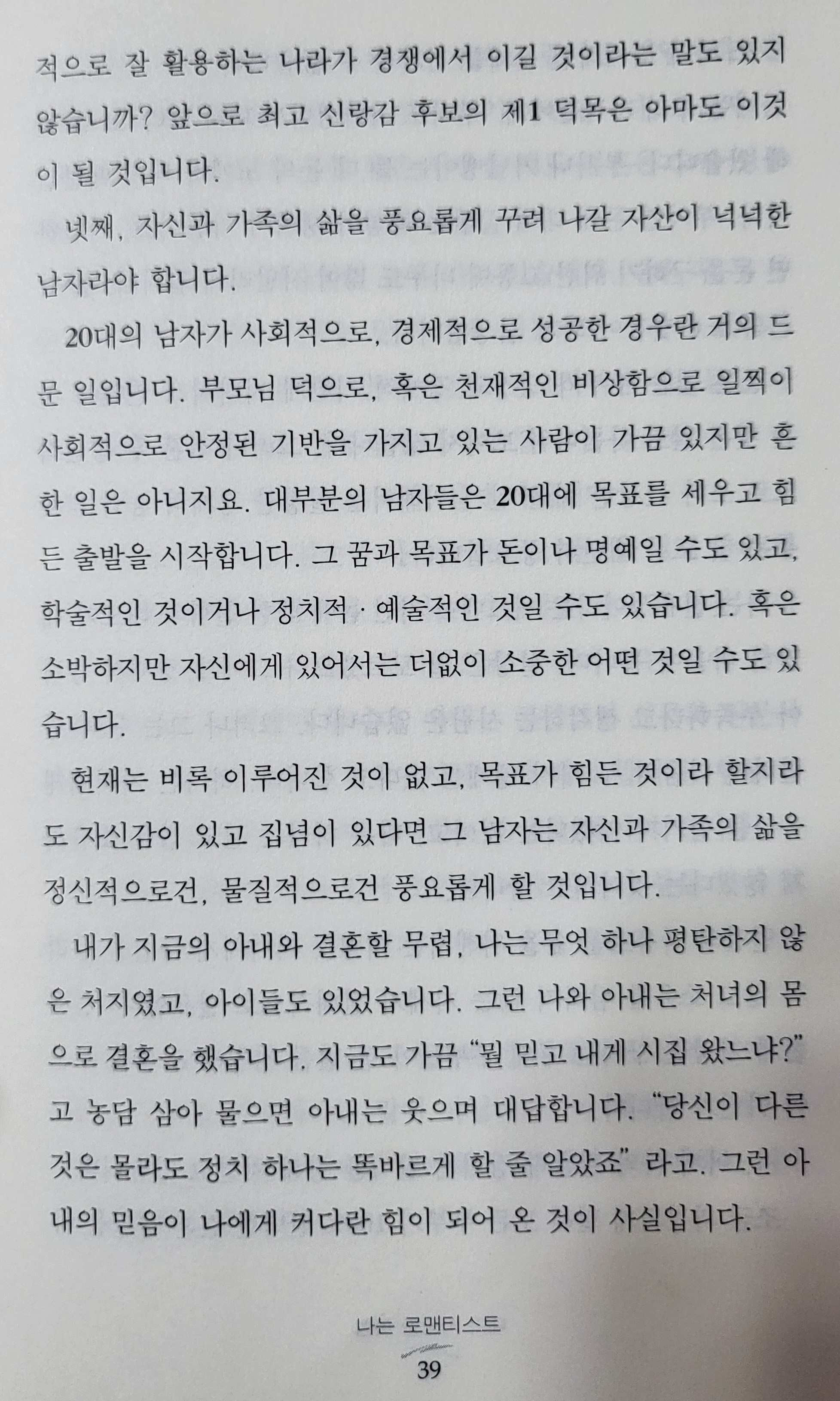 또한 그는 "20대의 남자가 사회적으로, 경제적으로 성공한 경우란 거의 드문 일"이라는 현실을 지적하면서, 20대 여성들이 남자를 고를때 <그 남자의 현재 경제적 여건이 아닌, 목표의식과 자신감과 집념>에 초점을 맞춰야 한다고 강권하고 있다.