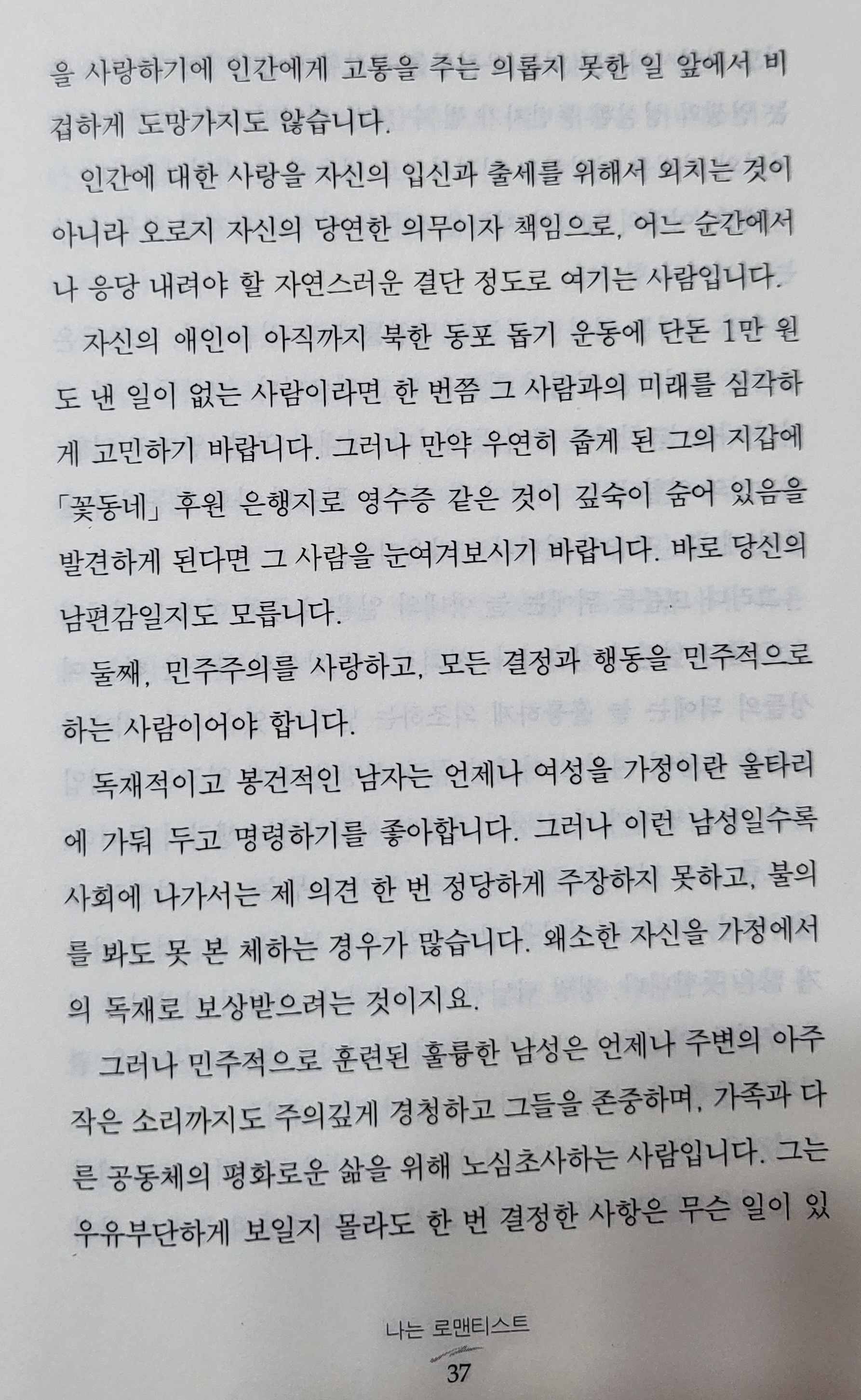 허나 민주주의가 체화된 사람들은 연애할 때나 결혼생활을 할 때나 주변의 아주 작은 소리에도 주의깊게 경청하고 상대방을 존중한다.
