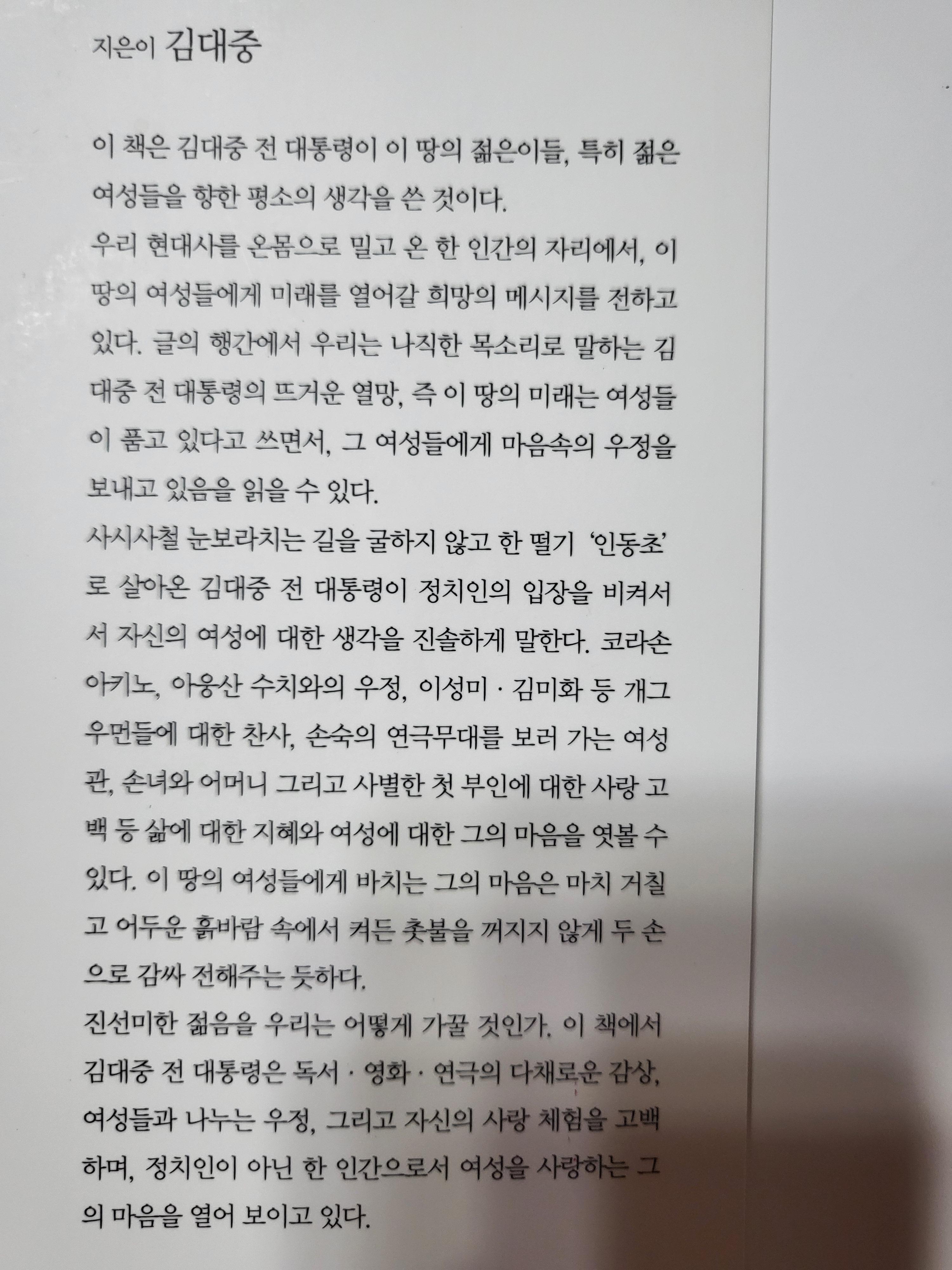 그 밖의 다른 주제와 분야에 대한 김대중의 생각과 경험도 들어볼 수 있기 때문에, 우리 여성들은 이 책을 통해서 '김대중'이란 인물을 간접적으로 체험해볼 수 있고, 그런 체험을 통해 인사이트를 얻고 견문도 넓힐 수 있는 기회를 얻을 수 있다.