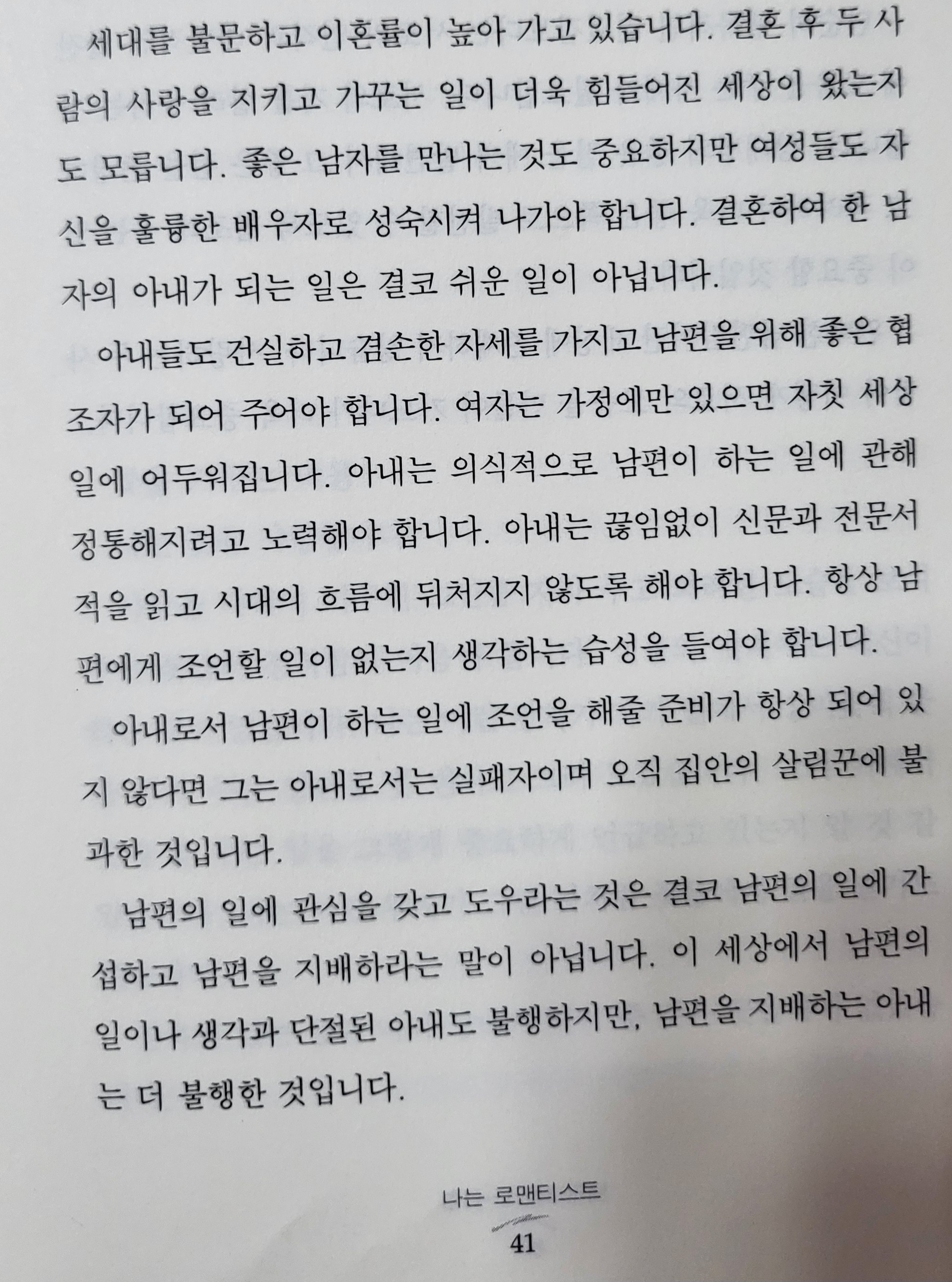 그러면서 그는 "아내들도 건실하고 겸손한 자세를 가지고 남편을 위해 좋은 협조자가 되어줘야한다"고도 피력하고 있다.